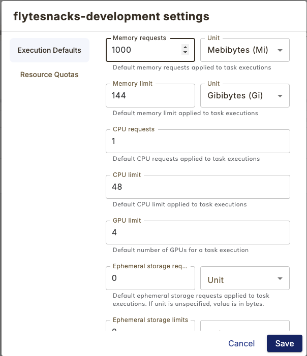 The execution defaults and resource quotas can be found on the right sidebar of the Dashboard. They can be edited by selecting the gear icon: